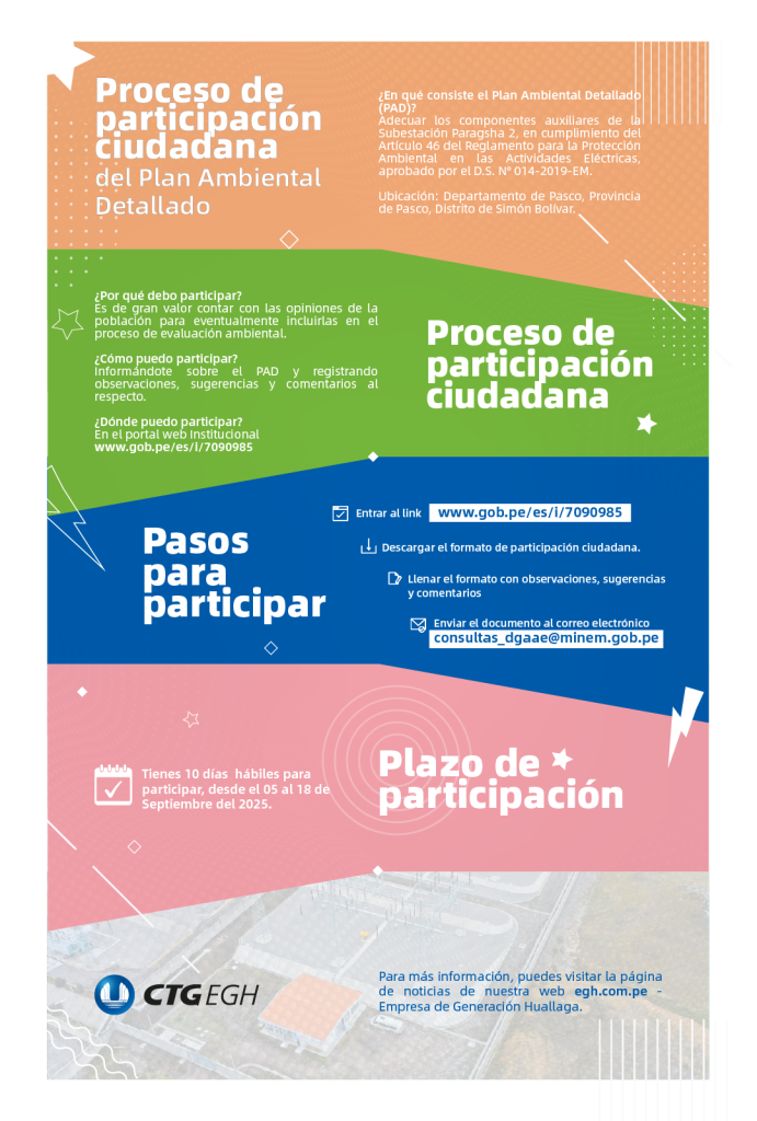 En Empresa de Generación Huallaga S.A. (EGH) hacemos público el Plan Ambiental Detallado (PAD) de los componentes auxiliares de la Sub-Estación Paragsha 2, ubicada en el departamento de Pasco, Provincia de Pasco, distrito de Simón Bolívar.